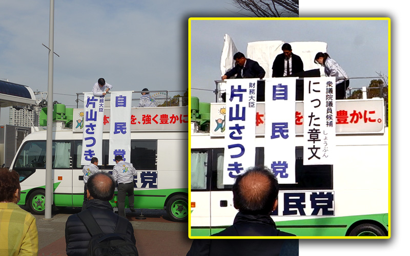 候補者の「にった章文」さんの垂れ幕が、どうみても小さ過ぎ。