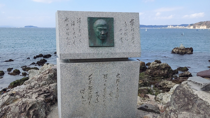 神社の背後に、海を背景にした石碑と裕次郎のブロンズ製レリーフがある。レリーフはぜんぜん似てないしすごくヘタクソ(作者は不明)。