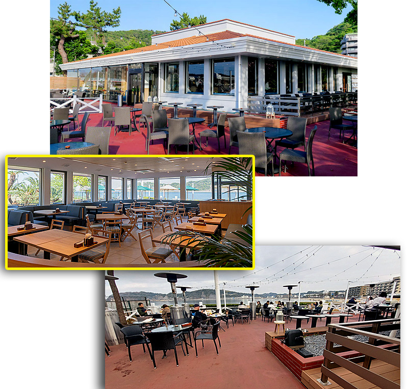 「なぎさ橋珈琲」は外食企業のコロワイド(株)の運営。この建物は元はデニーズだったから普通の喫茶店と比べすごく広い。とりわけ海を眺める広いテラス席で知られてる。