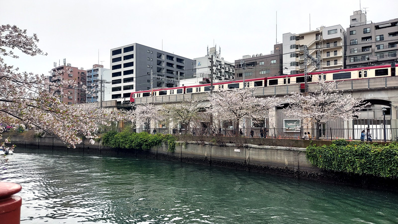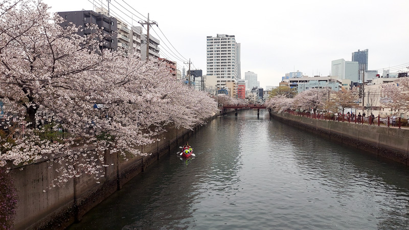 目黒川や神田川は川幅がすごく狭い。だから両岸から川の水面へ覆いかぶさるように張り出した枝の満開桜がみどころ。でも大岡川は、川幅が広いから川面(かわも)がもっと広々としている。