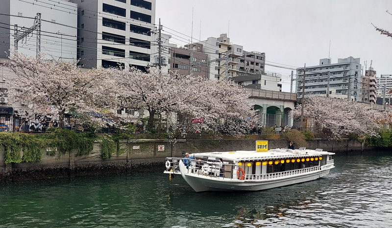 その代わり、小さなボートやデッカイお花見クルーズ船が、ひっきりなしに行き来する。社員旅行だろうか宴会で大盛り上がり。にぎやかな声が響いてる。木の下に車座になった宴会代わりに、行きつ戻りつする船内で宴会してるわけだ。傍目にみても楽しそうでした。