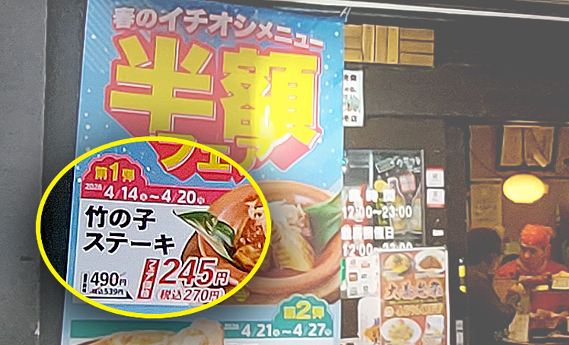 しかもデッカク「半額フェアー、竹のこステーキ 490→245円」とあった。