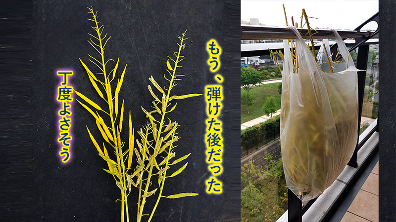 乾燥には、ほんとはビニール袋じゃいけないだろうけど、サヤから落ちるタネがこぼれそうなので、とりあえあえずこんな形で干してみました。